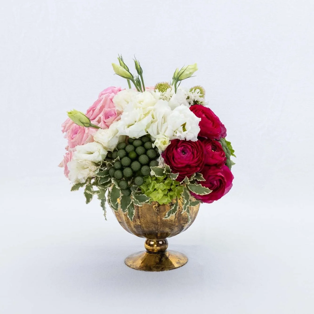 Glorious Pink, Red, and White Arrangement in Gold Footed Vase
