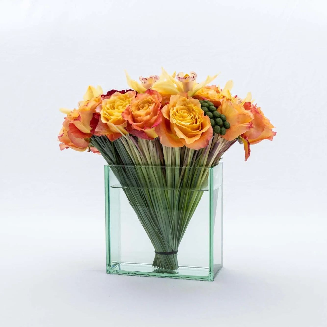 Chic Tangerine Rose Arrangement In Rectangular Vision Glass