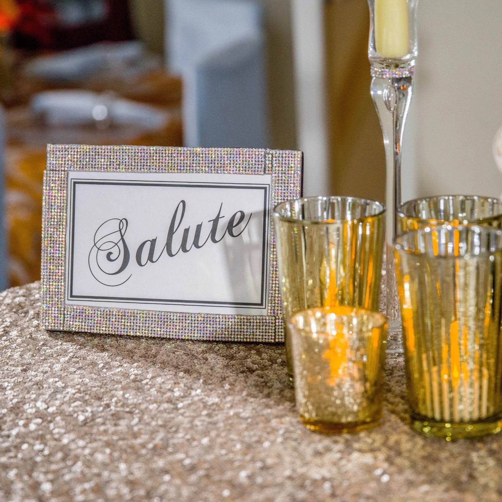 This style shoot was designed for cocktail or wine tasting parties. We used bright shades of turmeric with pops of red and pink for these effervescent blooms. The cocktail tables are draped in blush sequined silk linens. Each table had a hand tied bouquet of cream and pink blooms in a stylish raw silk covered vase. Various framed signs with different toasting expressions were also placed on the tables as conversation starters.