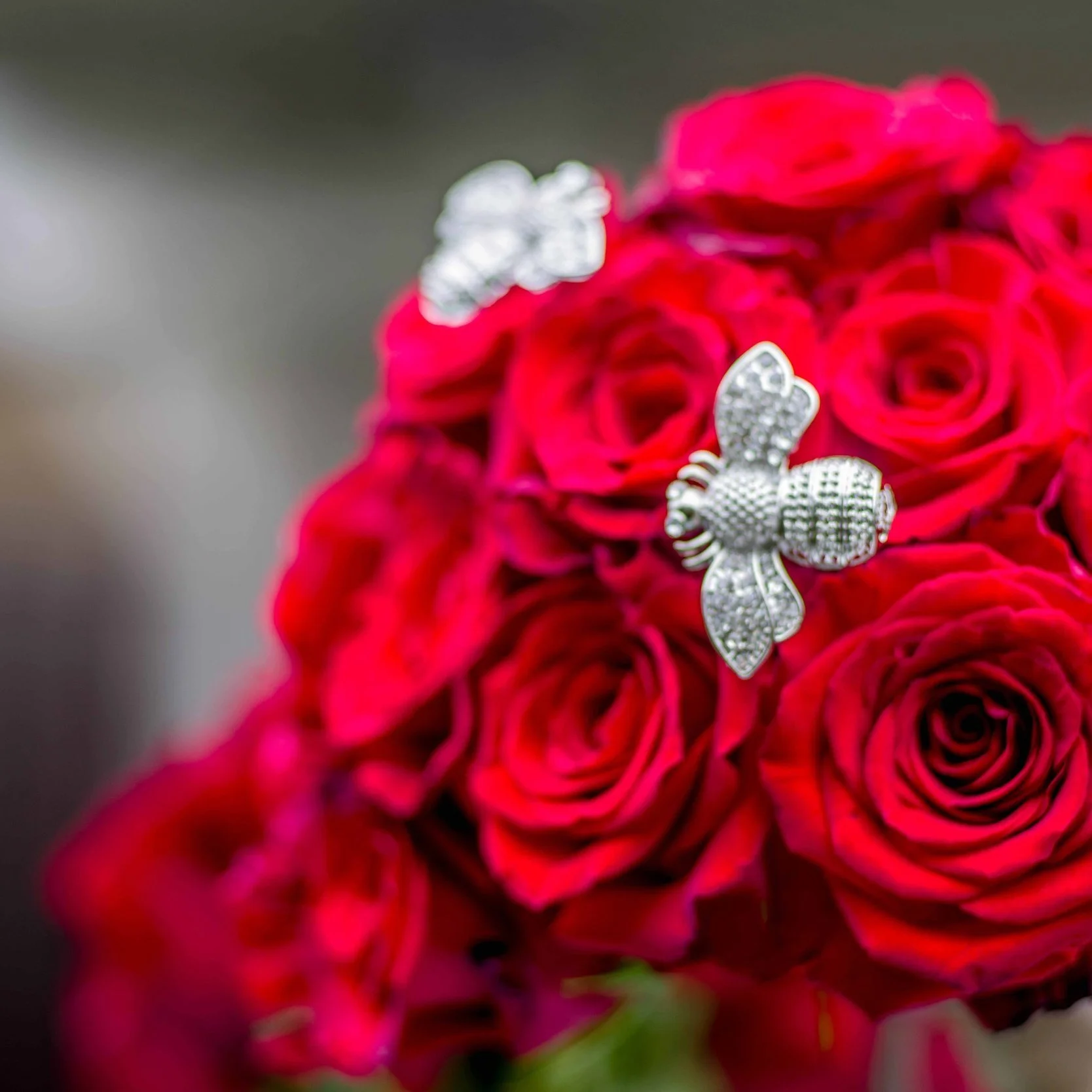 This chic style shoot is perfect for small events that want to leave lasting impressions. Everything was customized to make the biggest impact from hand tied bouquets to couture fabric cover vases. We used light blue table linens in this lovely silver and crystal table scape. Chairs were formally dressed in dark gray velvet slipcovers. The central arrangements were in tall vases with hand tied bouquets of ruby red roses and submerged red tulips. The accent arrangements feature red roses stylishly placed in custom raw silk covered square vases.