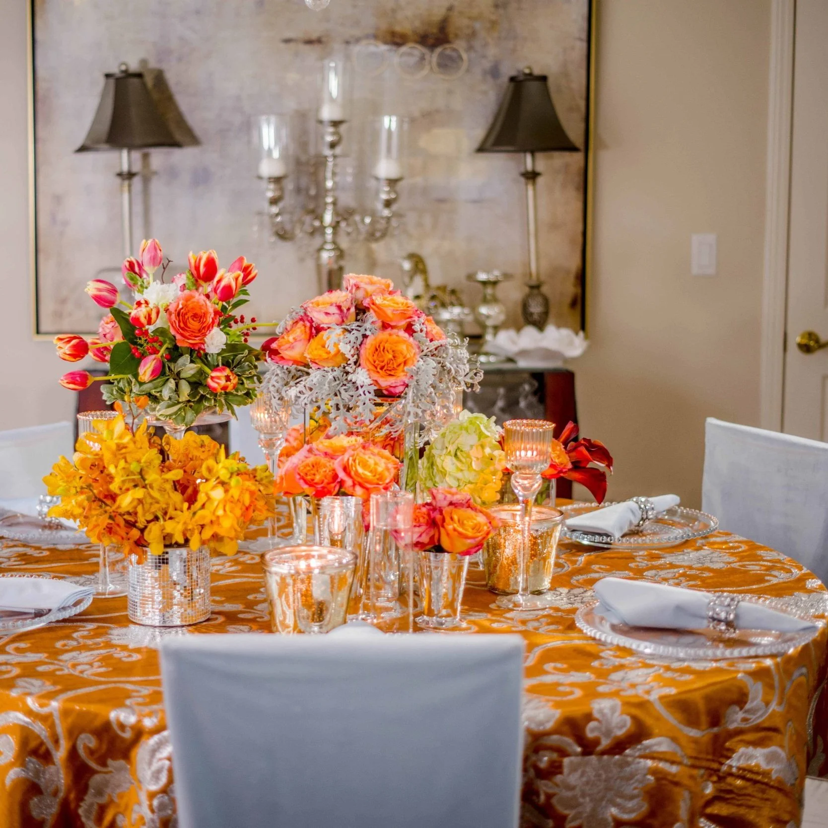 A bright and cheery style inspired by the luxurious camilla tangerine table linen by Youngsong Martin.