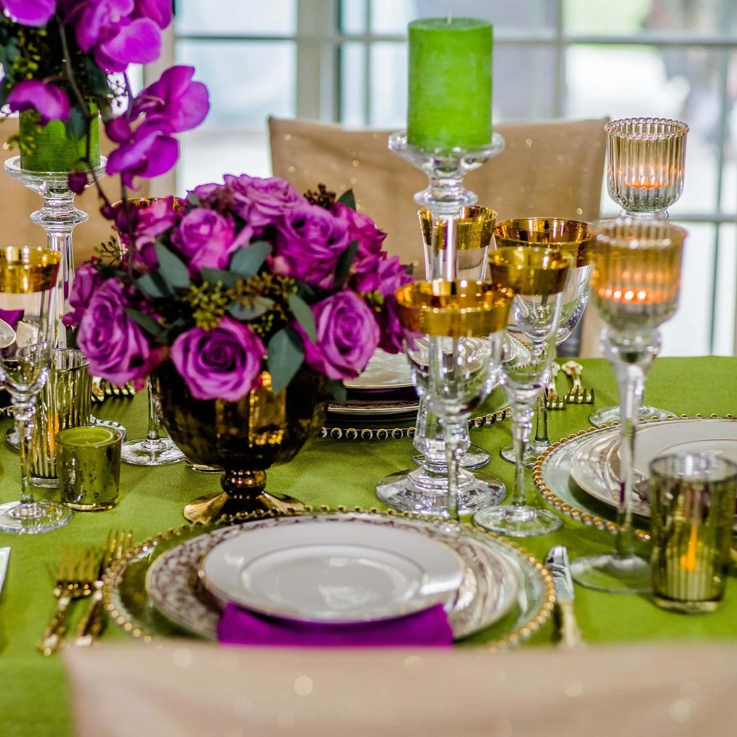 This style shoot we created a tablescape with a rich blue and white color scheme, inspired by Chinese porcelain pottery. We chose gorgeous porcelain China dinner and salad plates with royal blue napkins and placed an origami style porcelain bird as a chopstick rest. The floral design arrangement for this style showcased velvety cream color blooms in sparkling white vases of various heights and styles. We finished the look with lots of mercury gold votives and elegant footed candle holders. Creme Roses, Hydrangeas, Lisianthus, Gardenia, and cherry blossom branches with Seeded Eucalyptus.