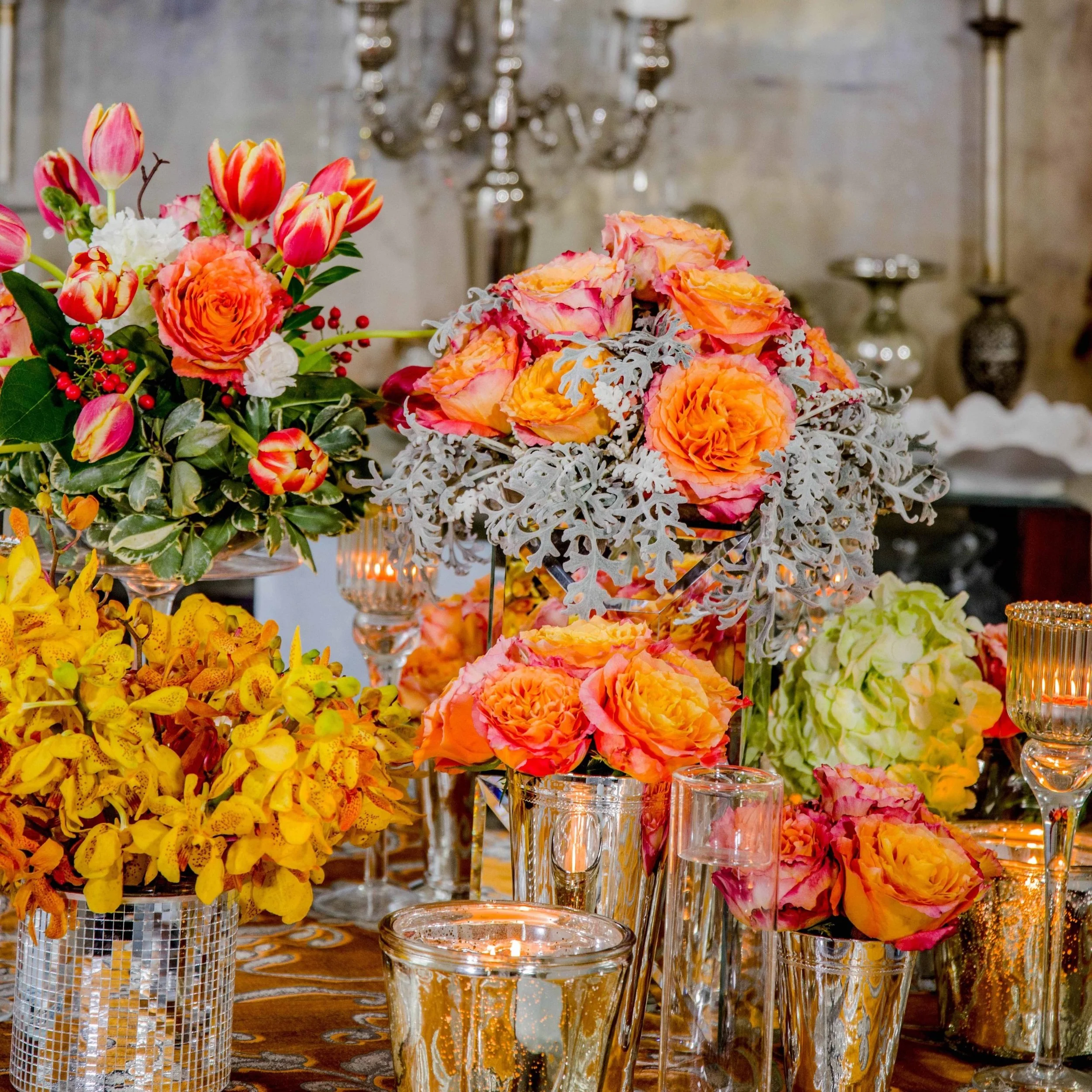 This bright and cheery style was inspired by the luxurious camilla tangerine table linen by Youngsong Martin. It’s rich and regal nature lends itself to an elegant event. I utilized soft gray velvet napkins with glistening gemstone napkin holders on silver beaded chargers. The Chiavari chairs were also dressed with modern formal gray velvet chair back skirts. An analogous color scheme was used for the blooms to enhance the overall feel of this tablescape. Roses, tulips, calla lilies, mini gerberas, hepericum berries, hydrangeas and orange mokartables saturate the table with a variety of cut foliages like dusty millers, variegated pittosporum, myrtle and ruscus to complete this look. Various styles of vases were used to complete the luxurious look. This style was featured in Youngsong Martin’s pinterest board under “Orange + Yellow Wedding Ideas''.
